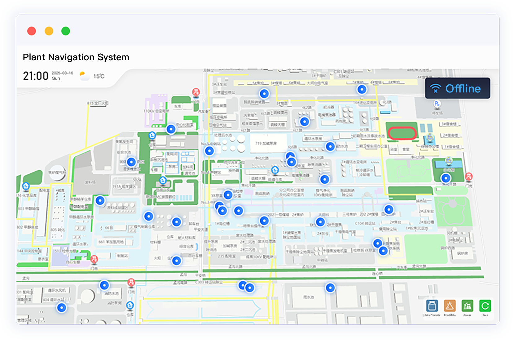 Through GPS and map engine integration, provide integrated positioning and navigation services for personnel and vehicles, reducing the time for trucks to find routes for unloading and loading, and improving the transportation efficiency of factory trucks.