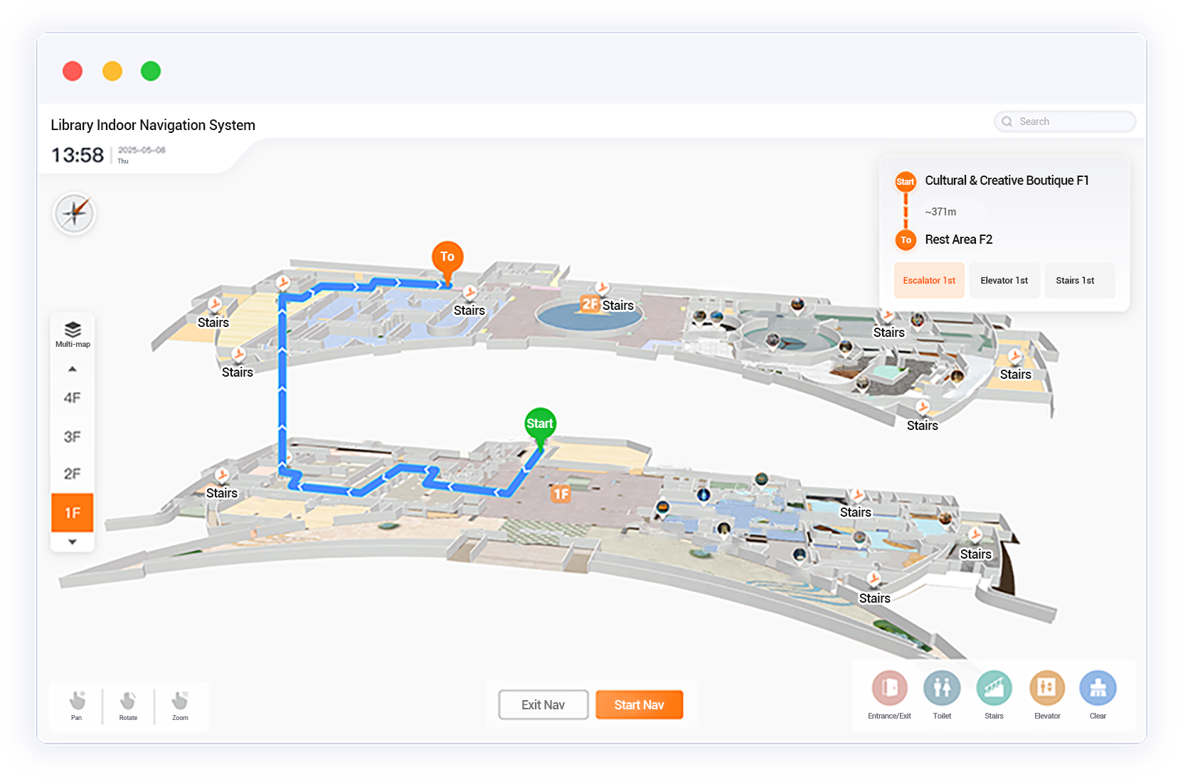 Build 3D electronic maps, book location navigation, VR panoramic guidance navigation and other library digital applications, providing intelligent guidance services for the entire borrowing process, improving readers' reading experience.